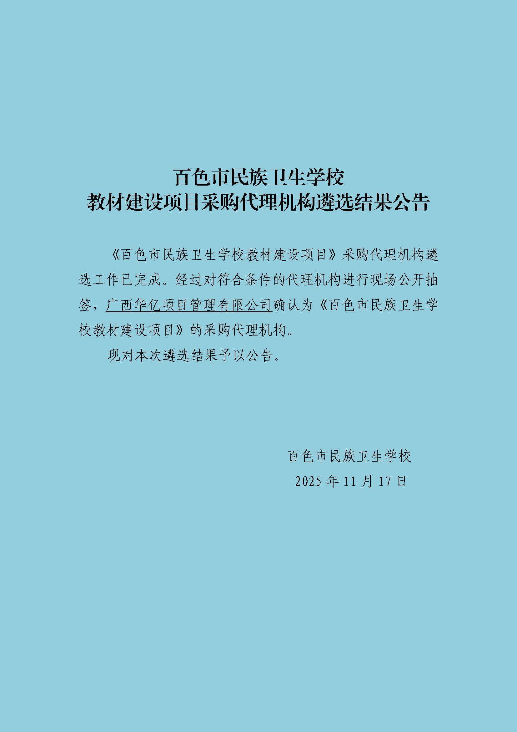 百色市民族卫生学校教材建设项目采购代理机构遴选结果公告