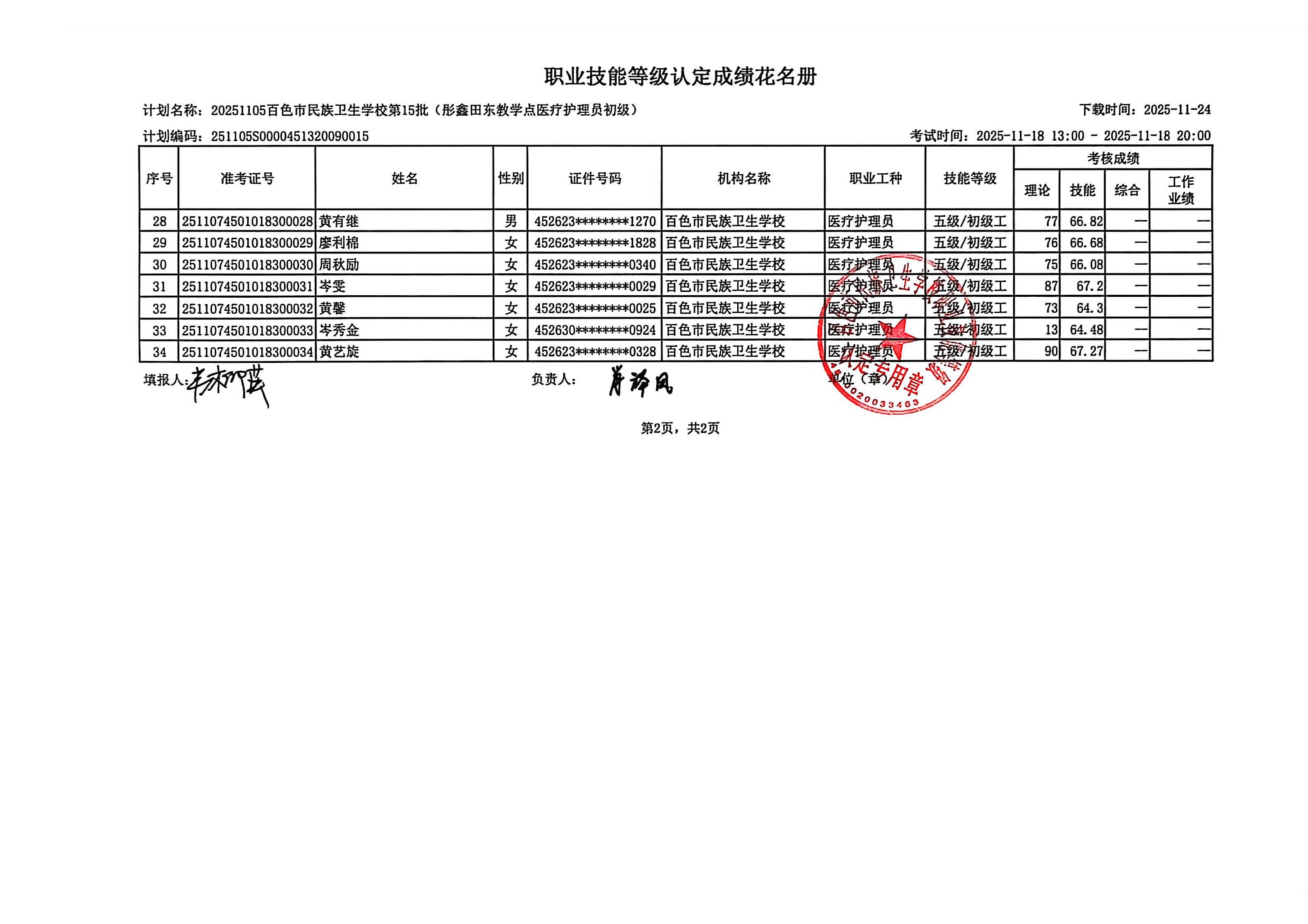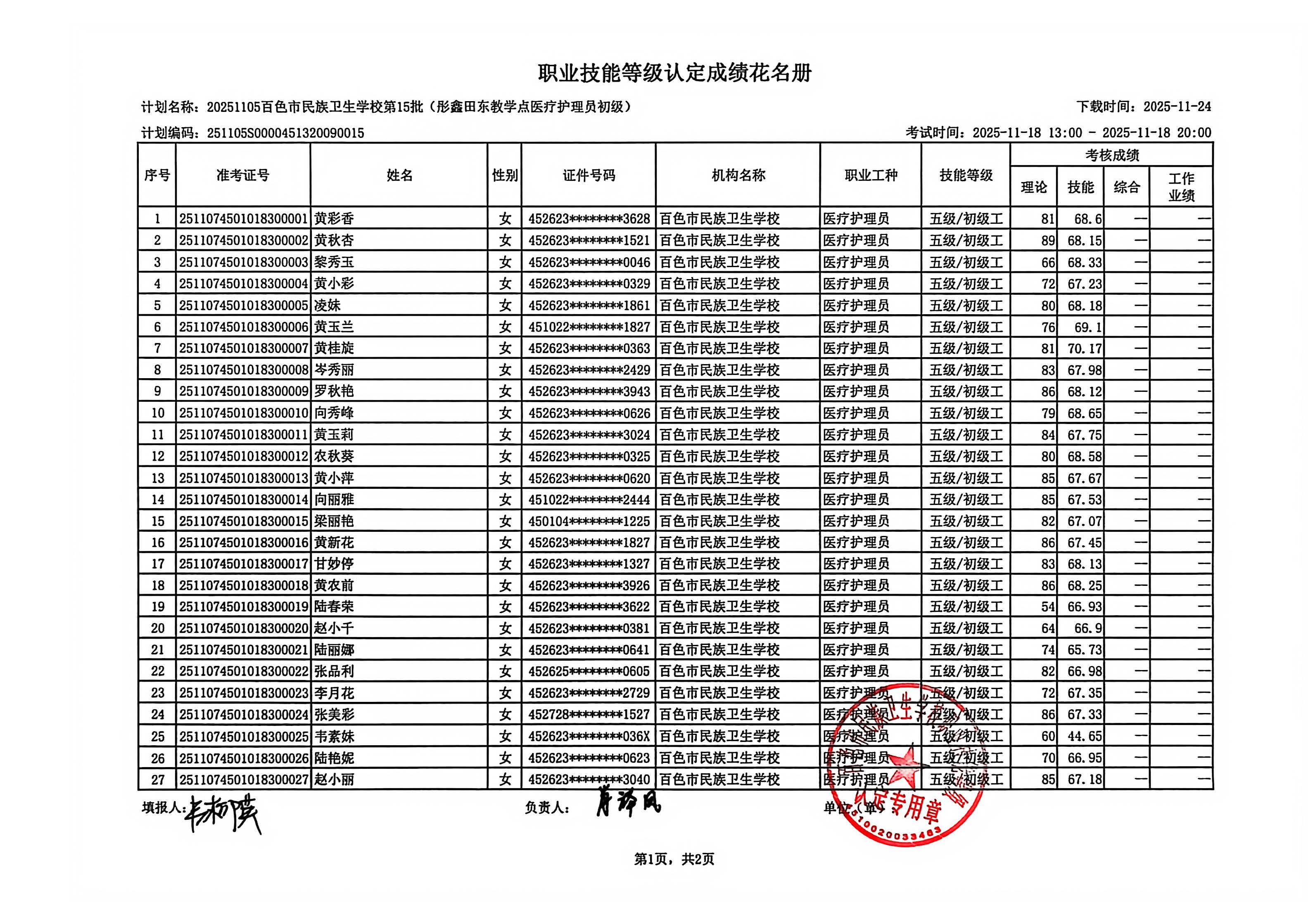 百色市彤鑫月嫂家政服务中心职业技能等级认定成绩公示(2025.11.18)
