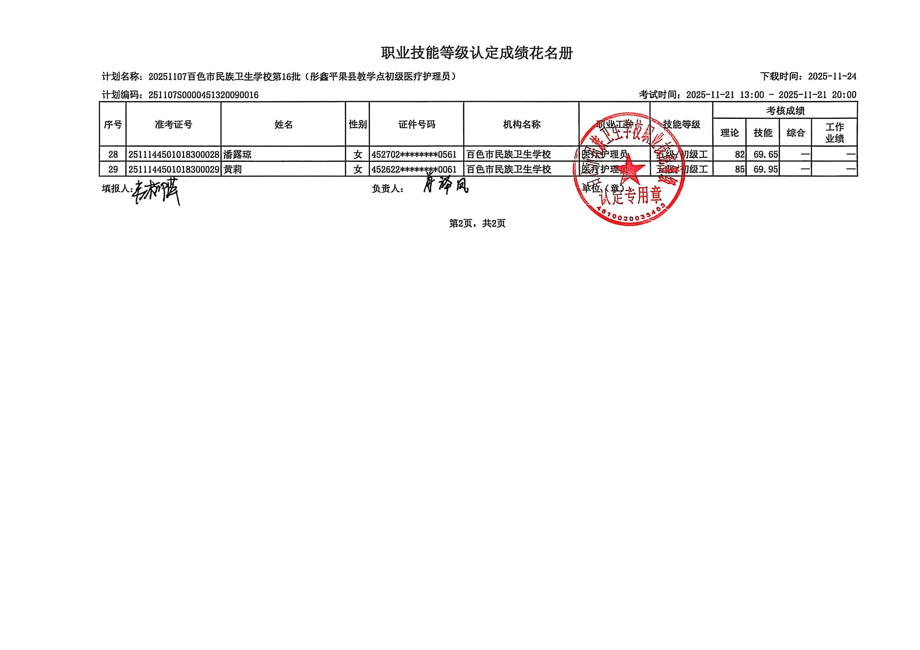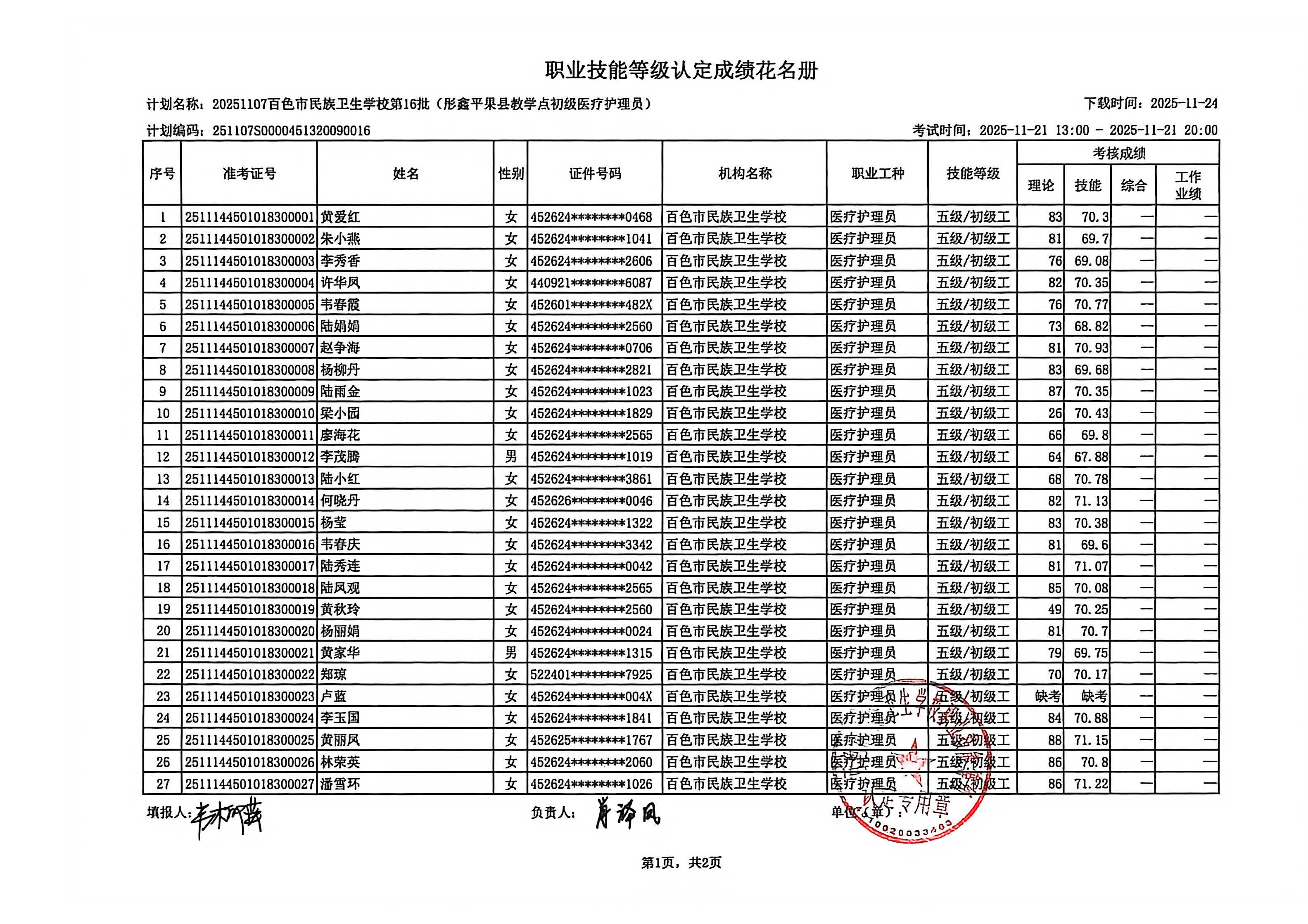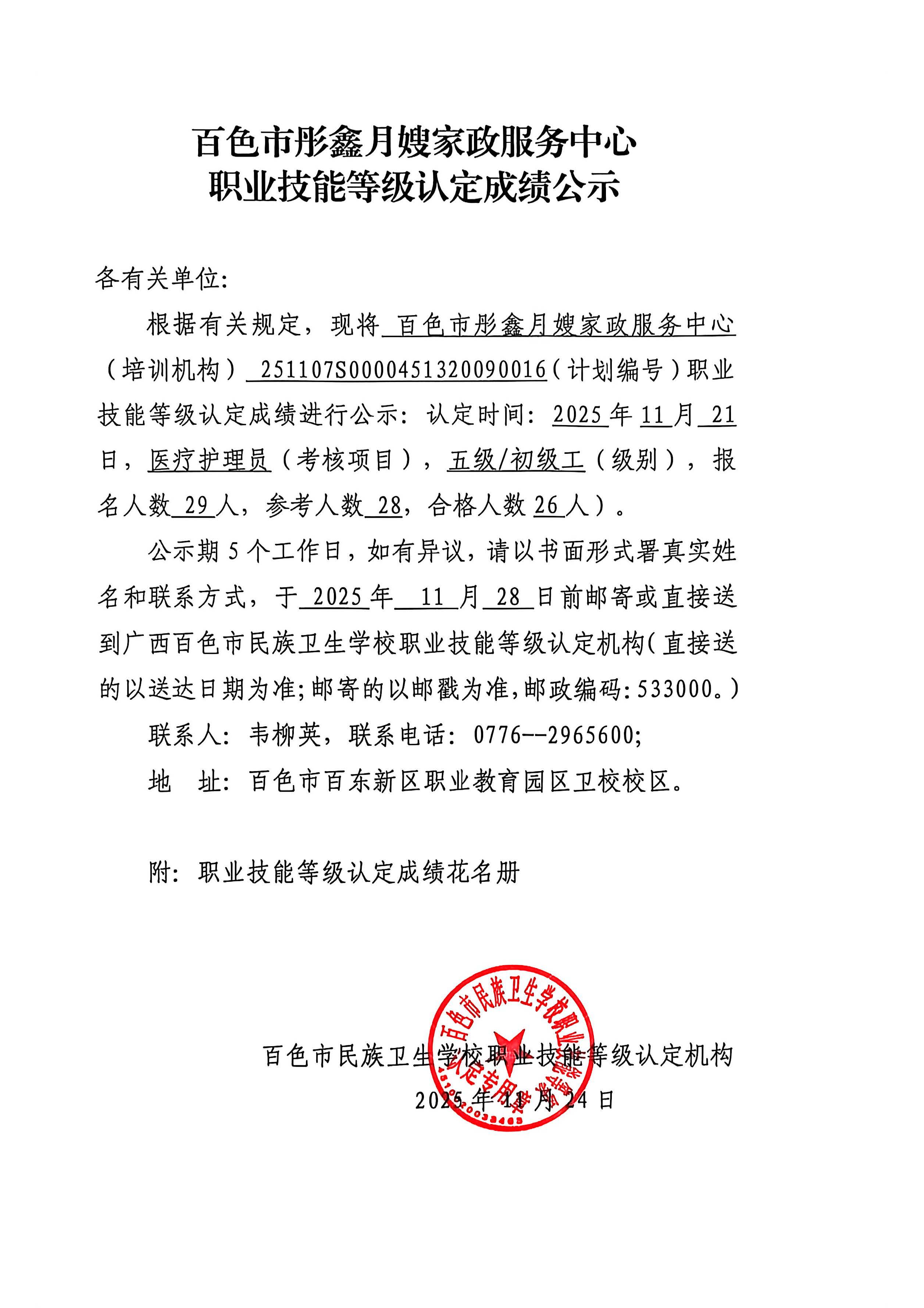 百色市彤鑫月嫂家政服务中心职业技能等级认定成绩公示(2025.11.21)