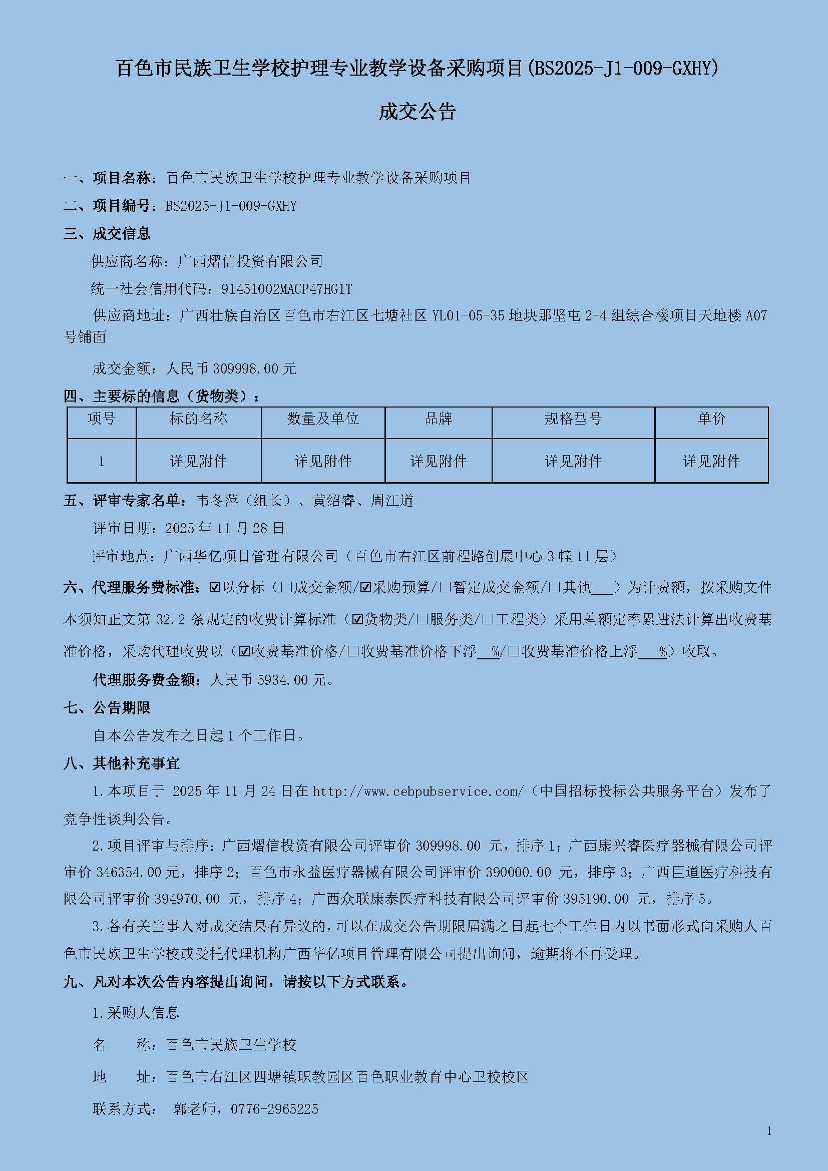 百色市民族卫生学校护理专业教学设备采购项目(BS2025-J1-009-GXHY)成交公告
