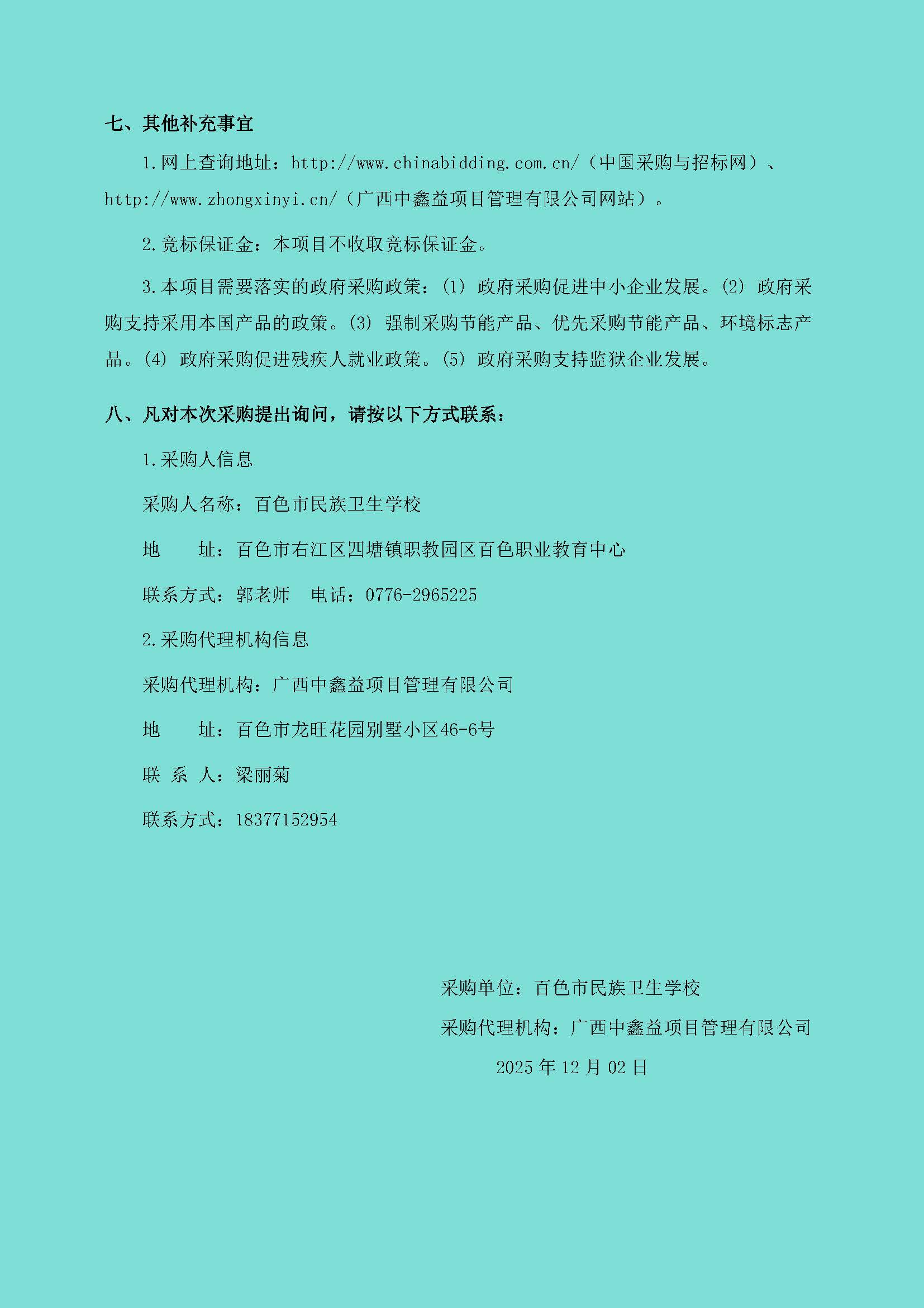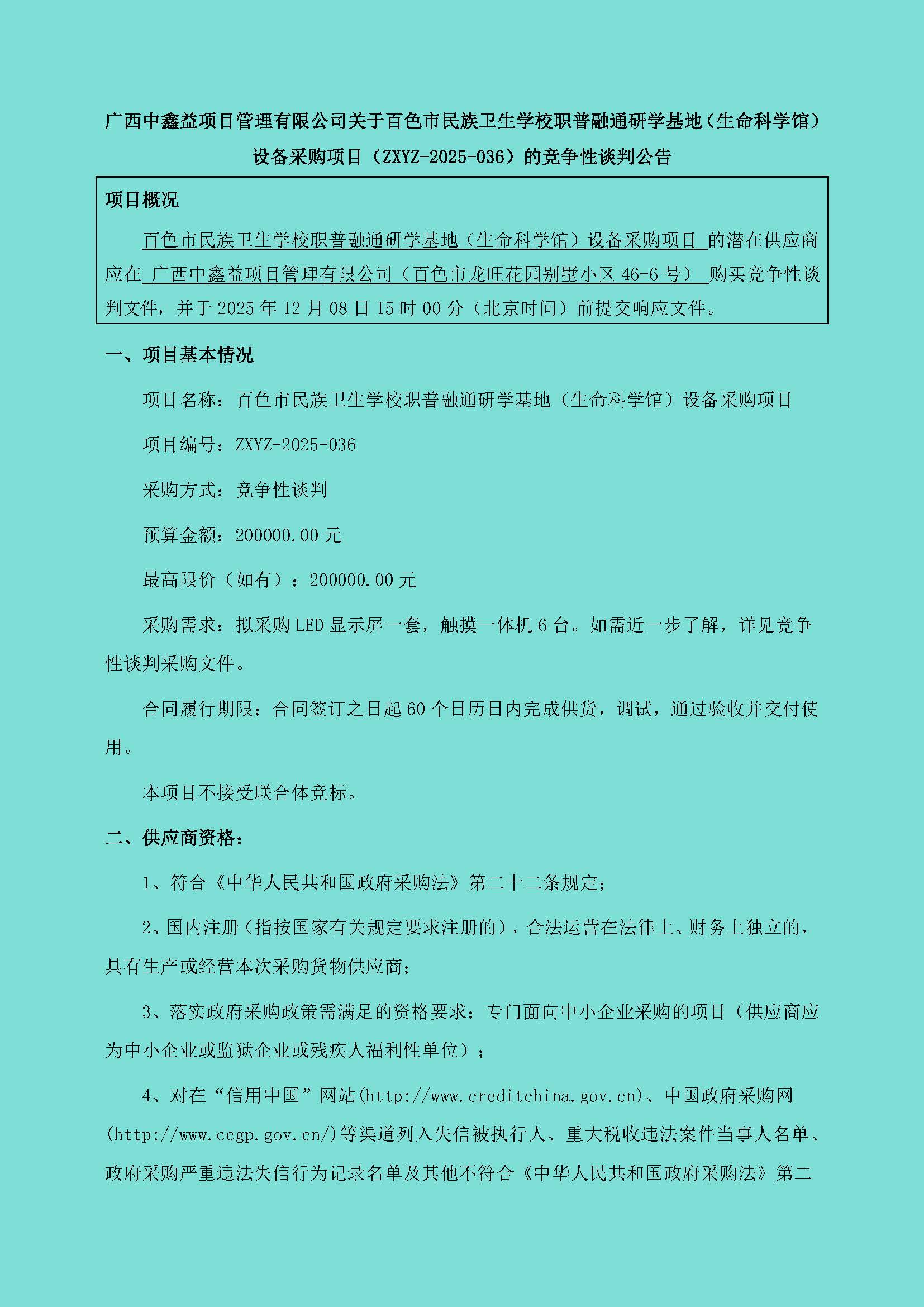 广西中鑫益项目管理有限公司关于百色市民族卫生学校职普融通研学基地(生命科学馆)设备采购项目(ZXYZ-2025-036)的竞争性谈判公告