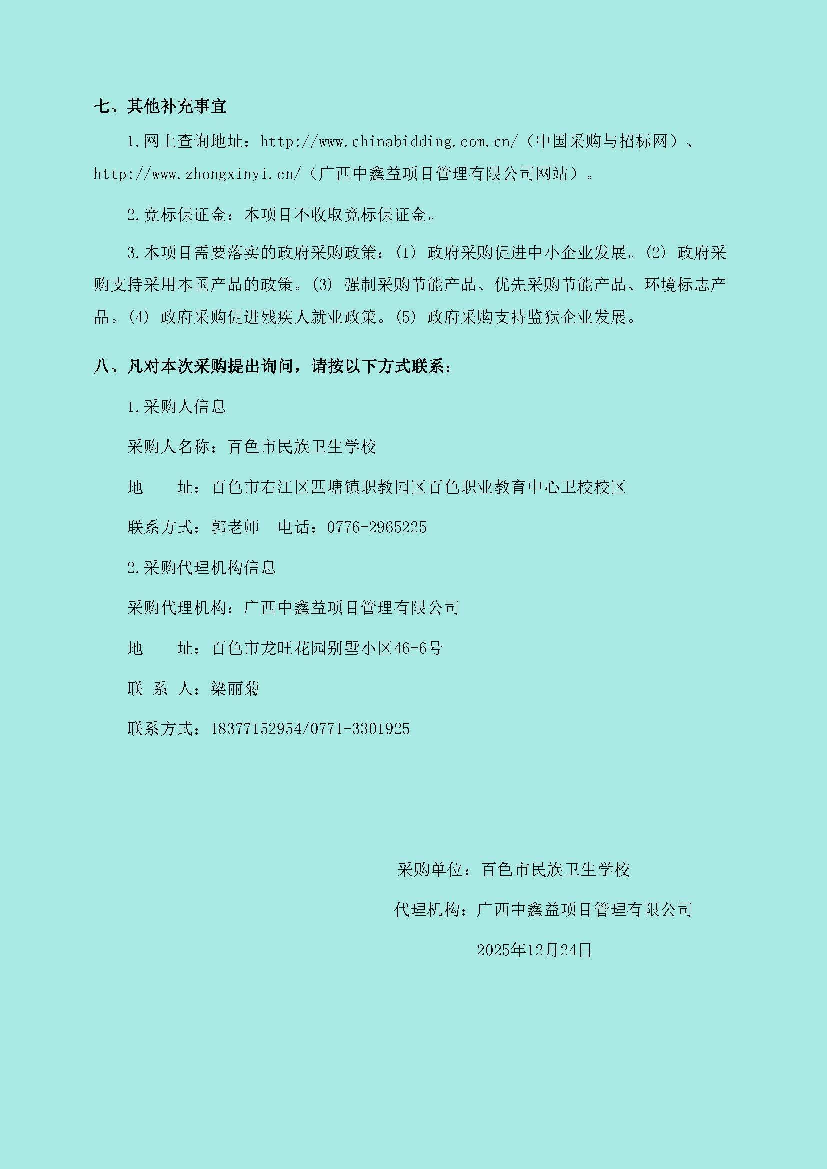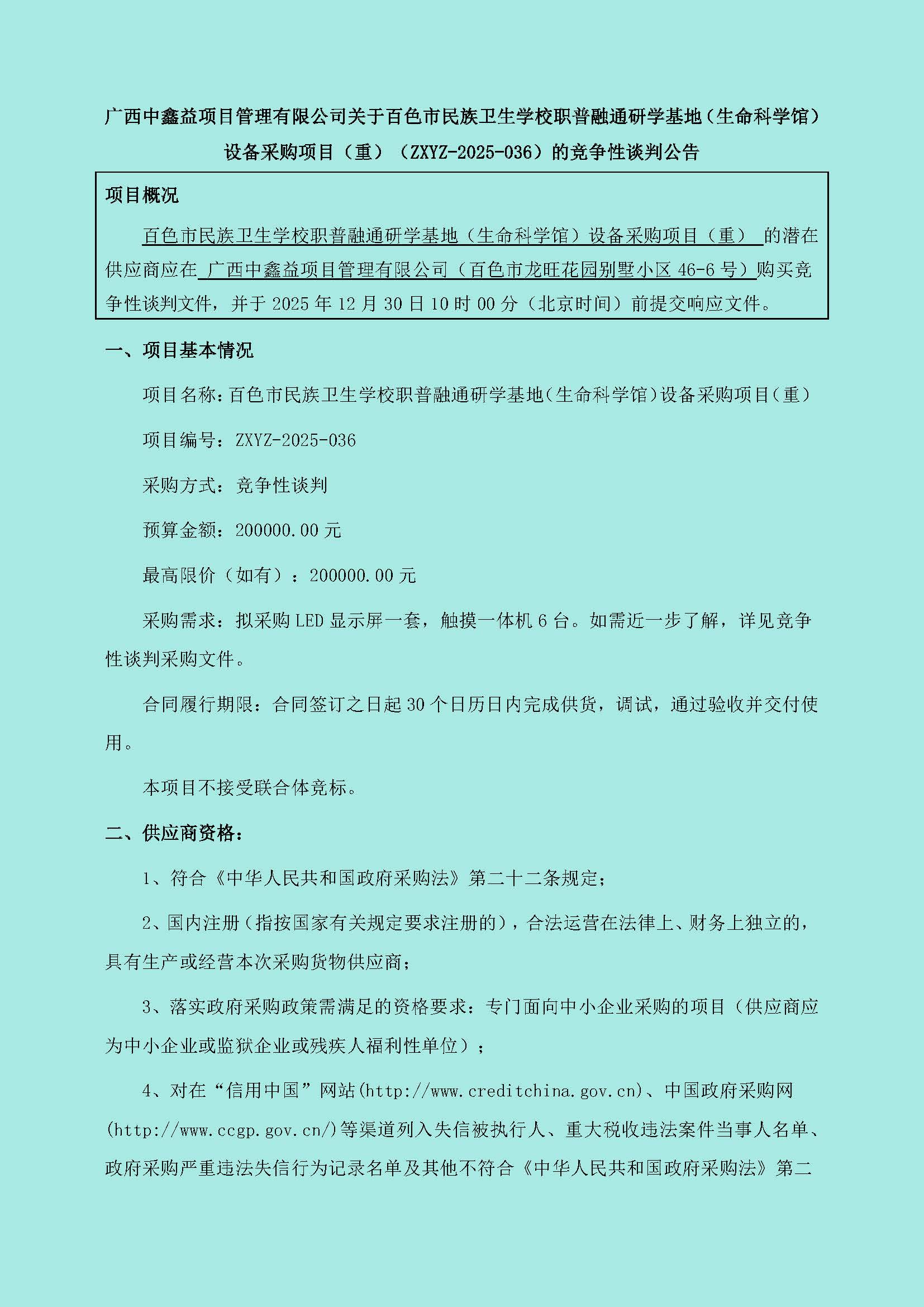 广西中鑫益项目管理有限公司关于百色市民族卫生学校职普融通研学基地(生命科学馆)设备采购项目(重)(ZXYZ-2025-036)的竞争性谈判公告