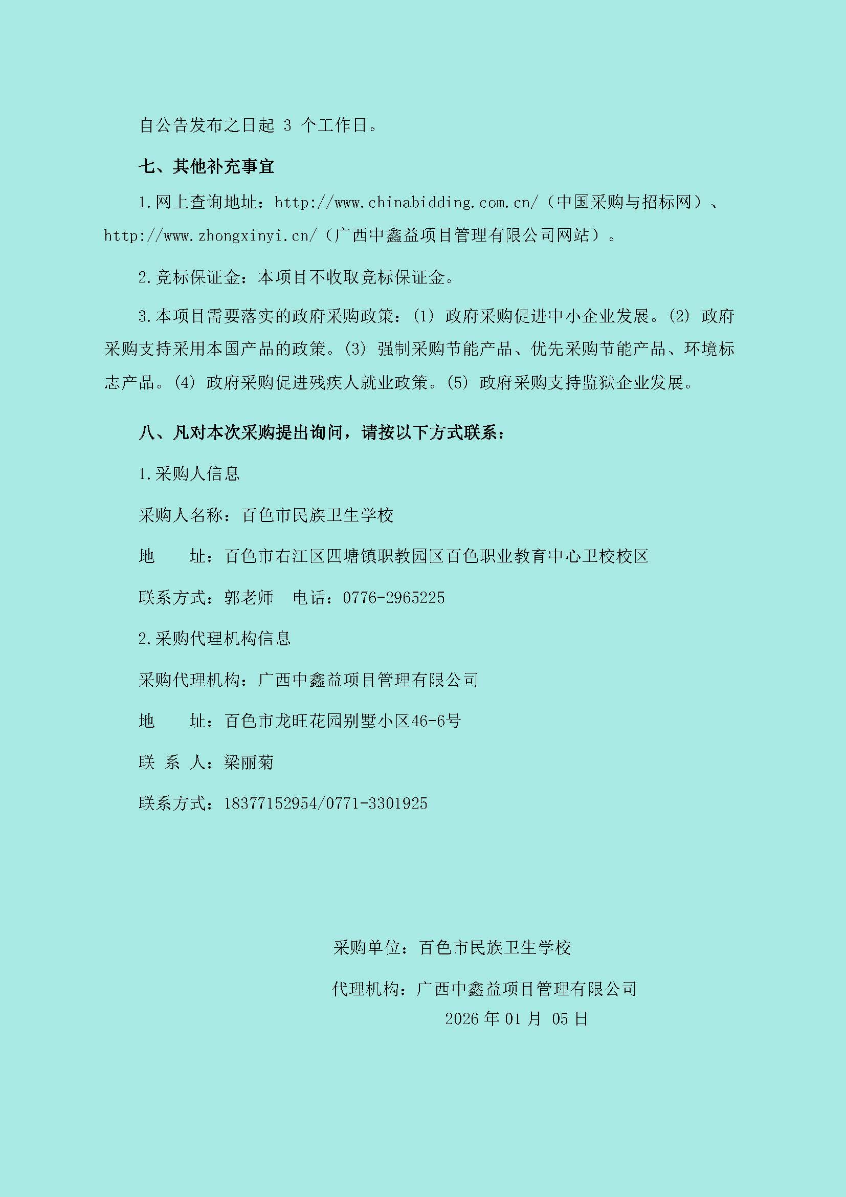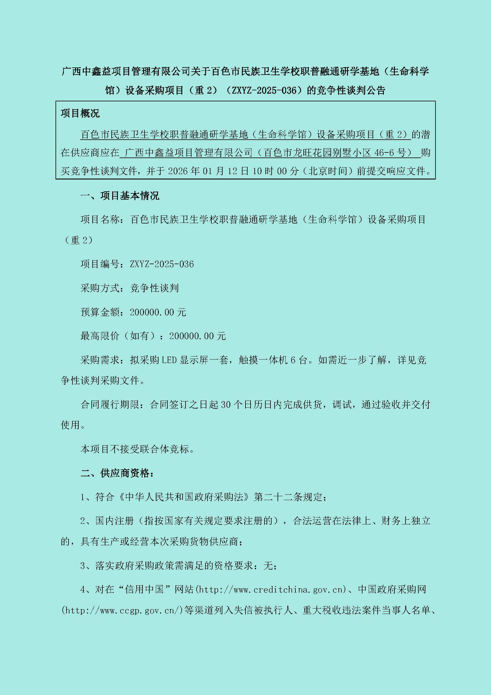 广西中鑫益项目管理有限公司关于百色市民族卫生学校职普融通研学基地(生命科学馆)设备采购项目(重2)(ZXYZ-2025-036)的竞争性谈判公告