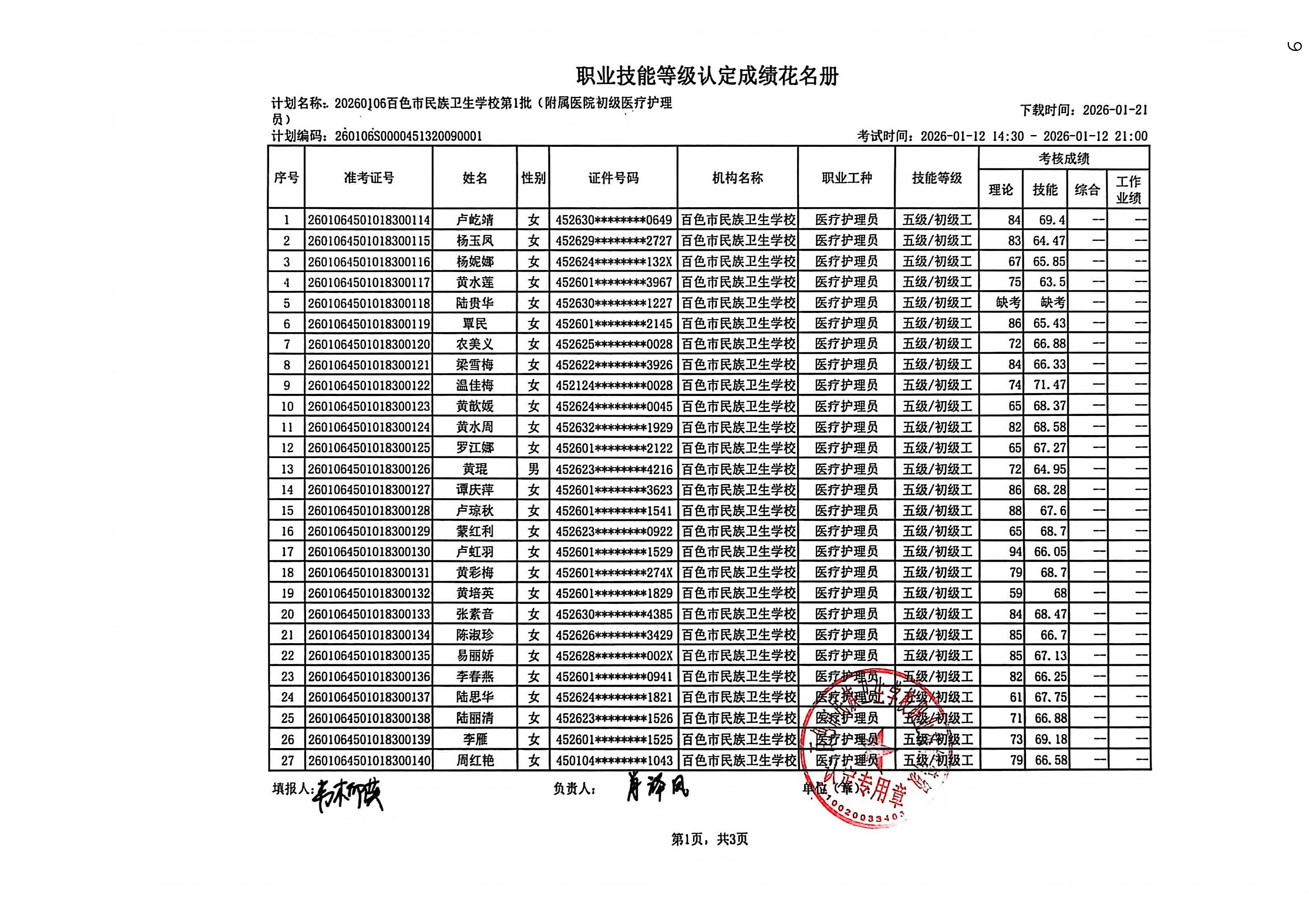 右江民族医学院附属医院职业技能等级认定成绩公示(2026.1.12)