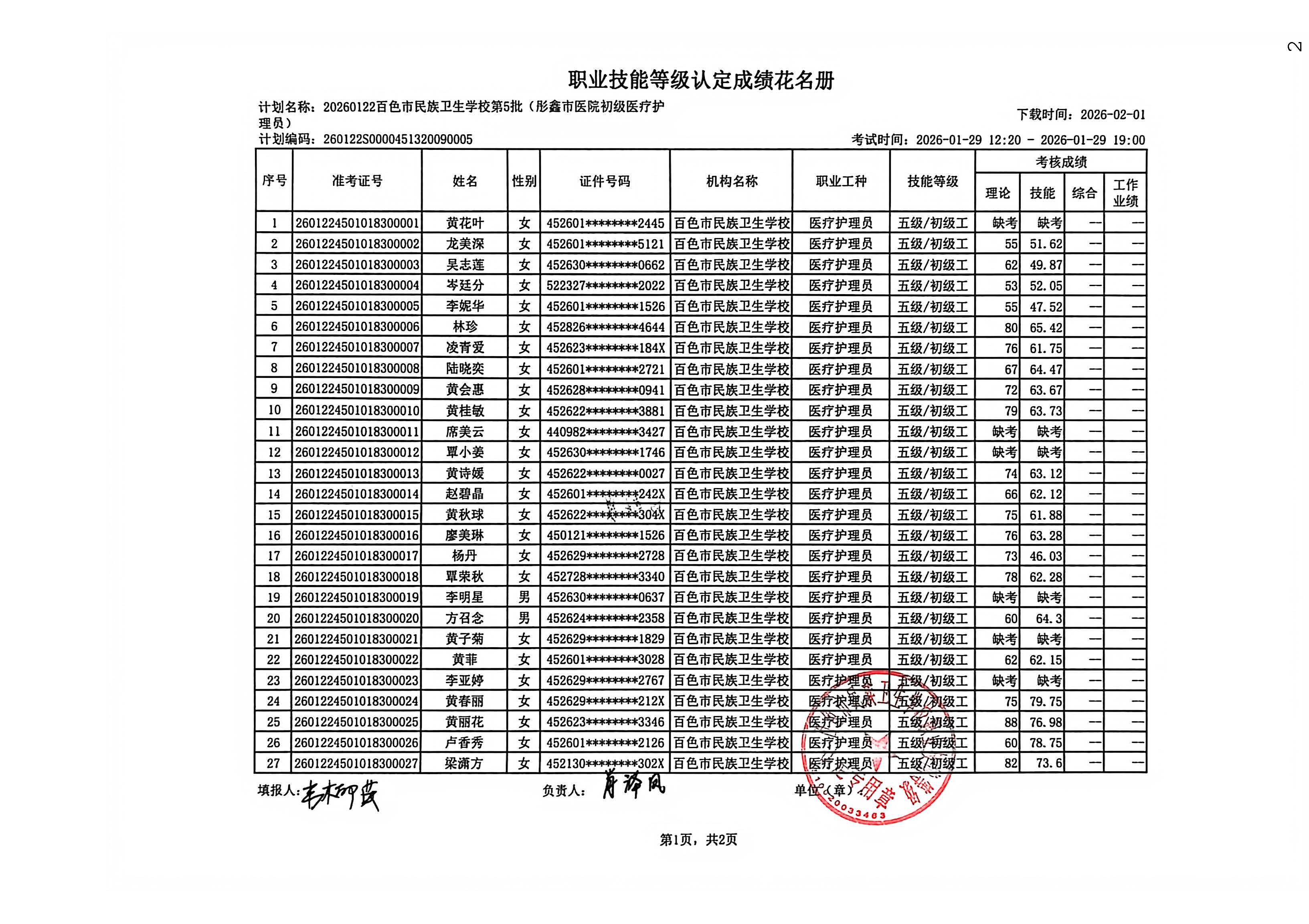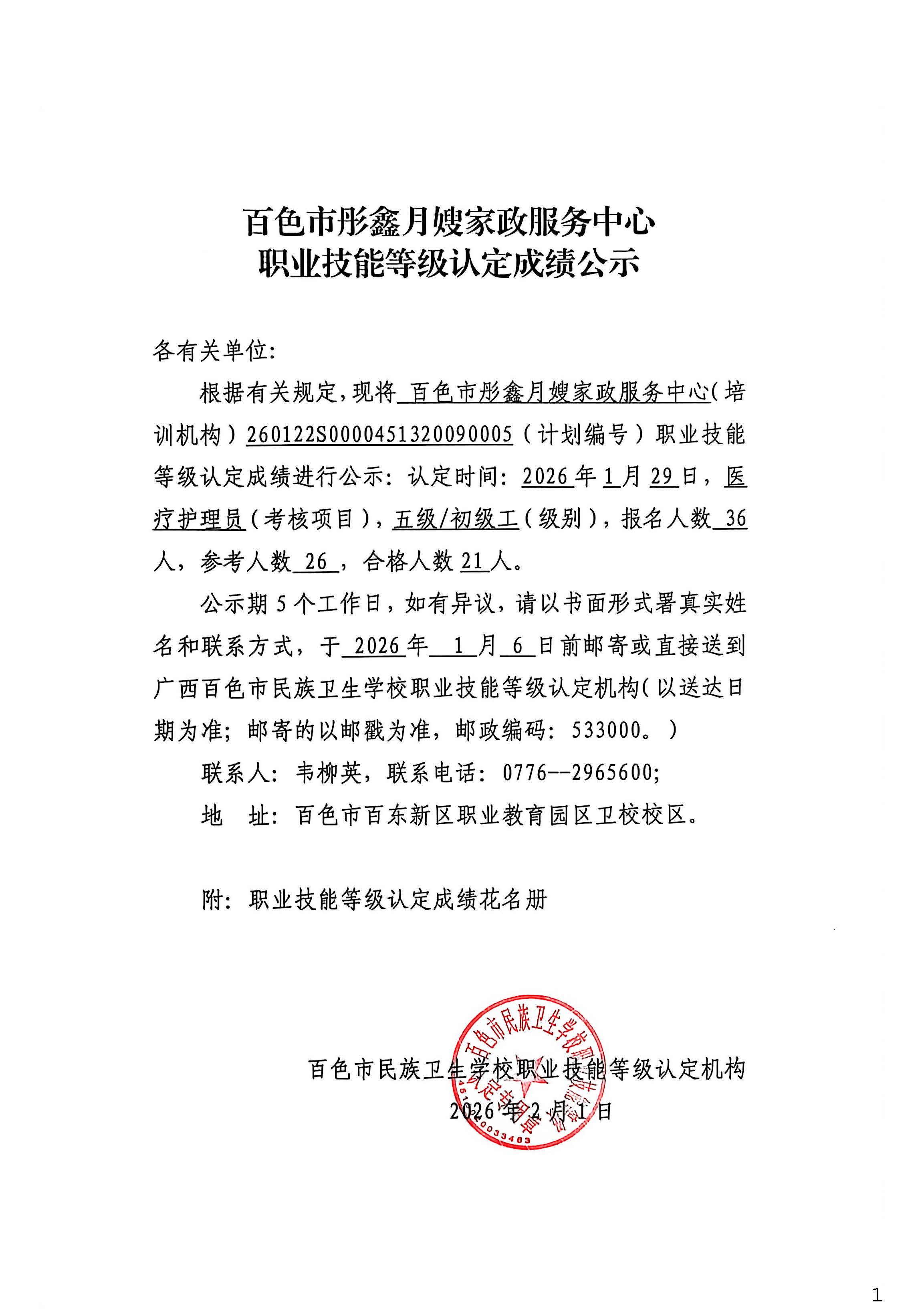 百色市彤鑫月嫂家政服务中心职业技能等级认定成绩公示(2026.1.29)