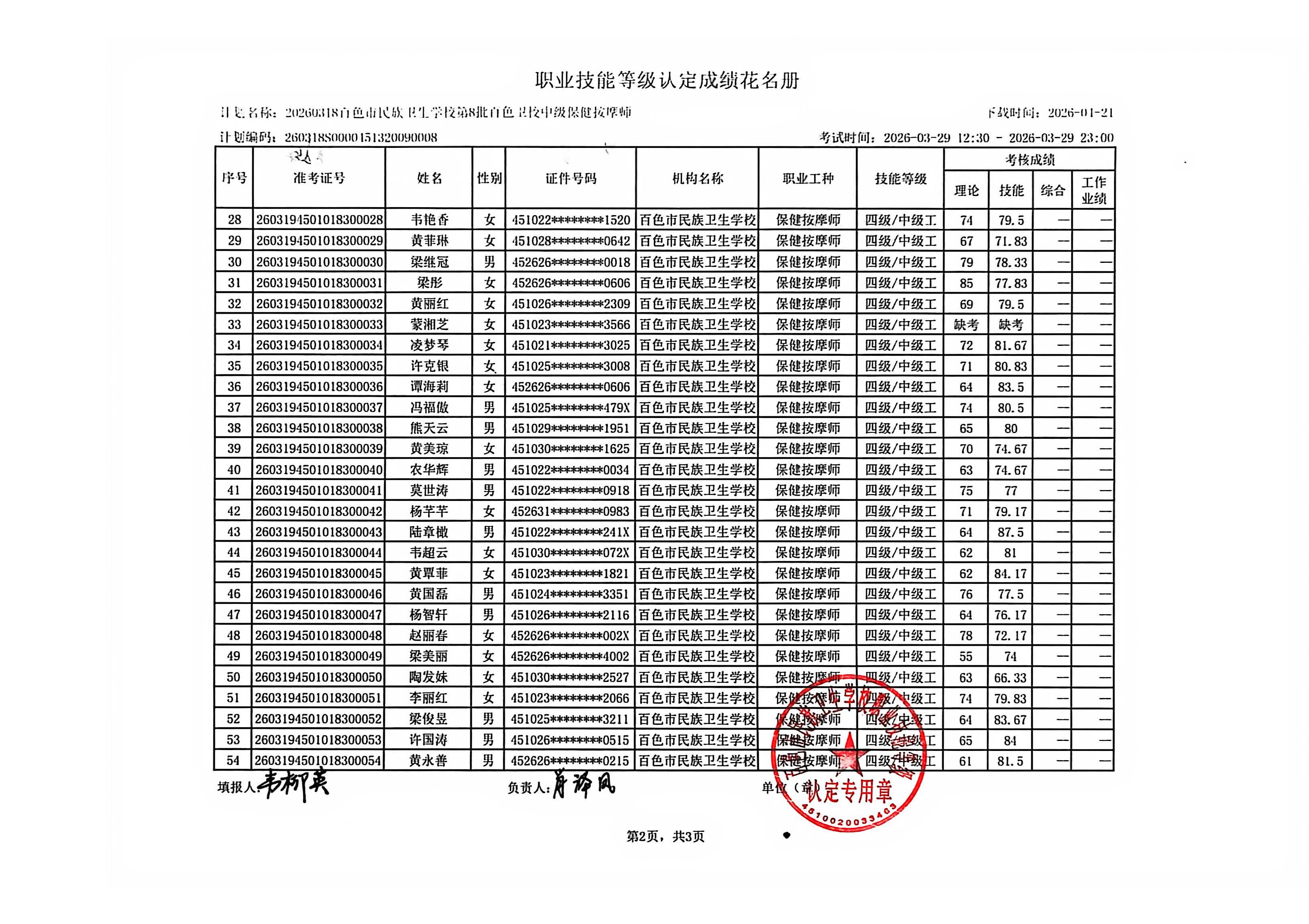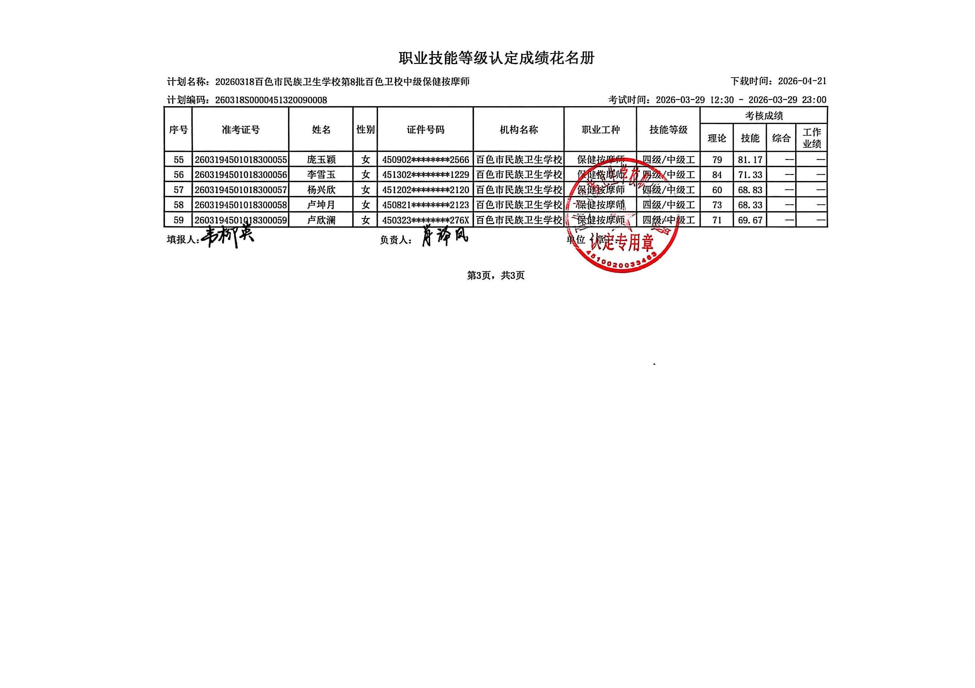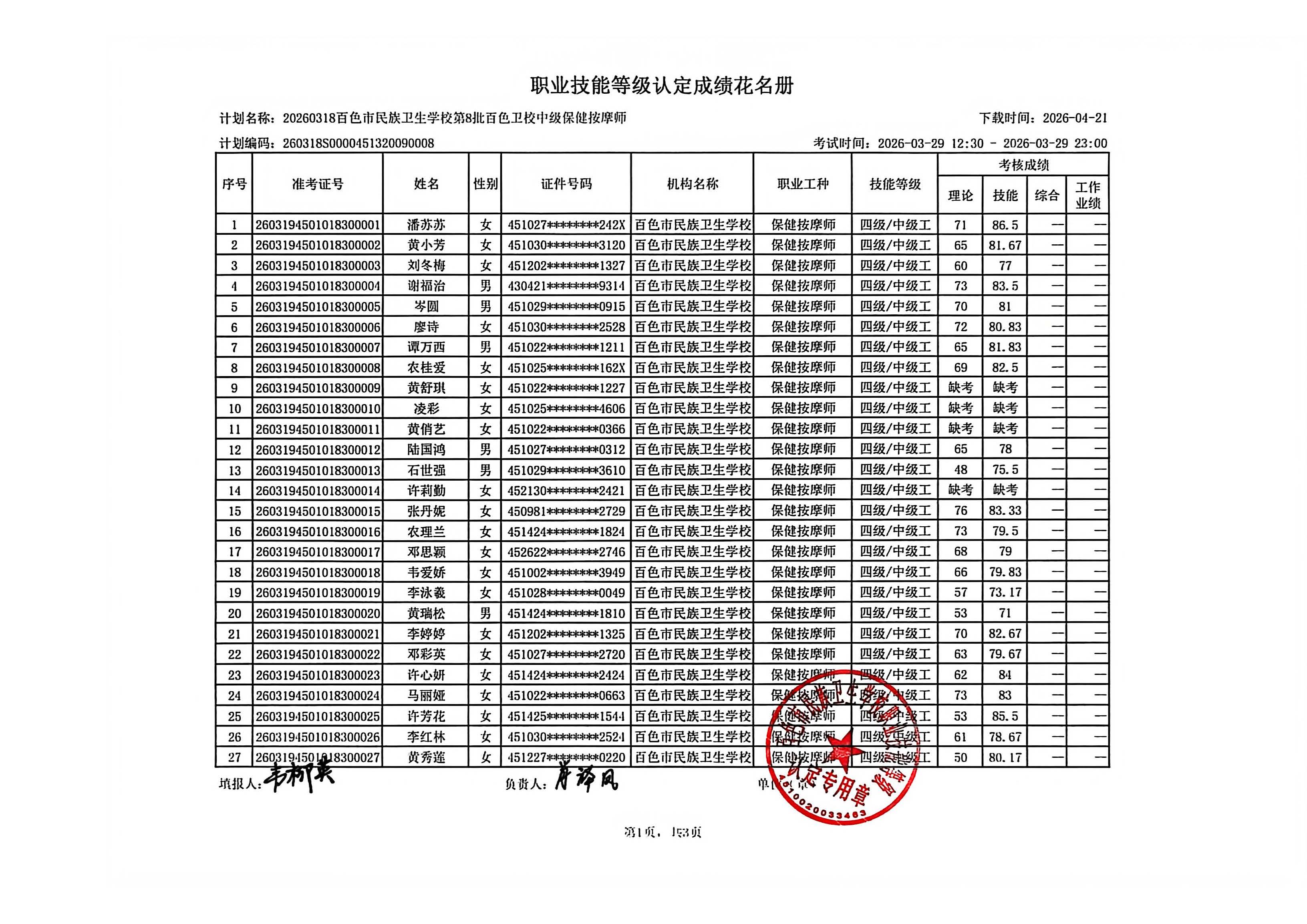 职业技能等级认定成绩公示(2026.3.29)