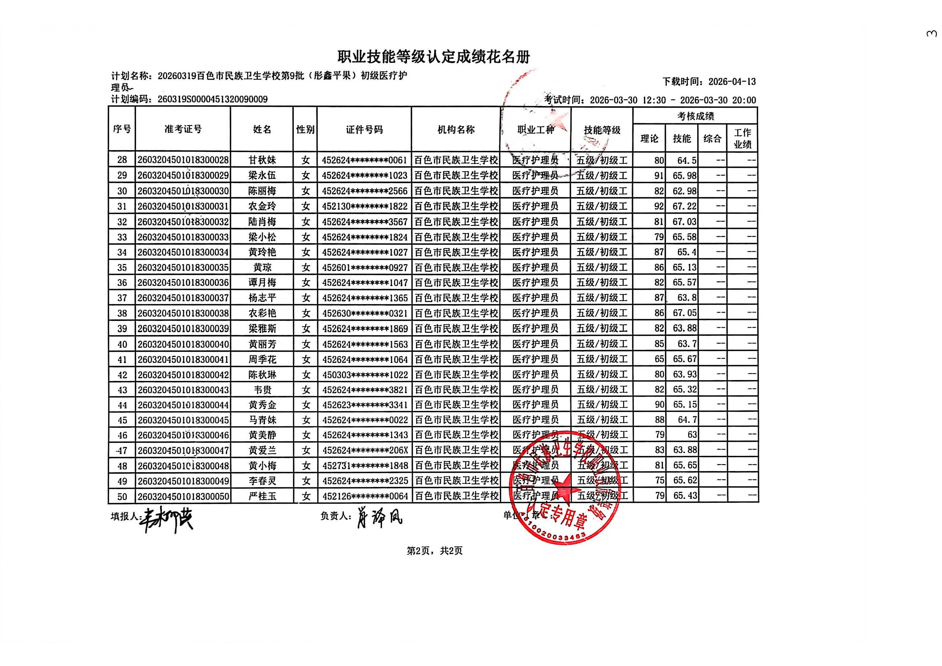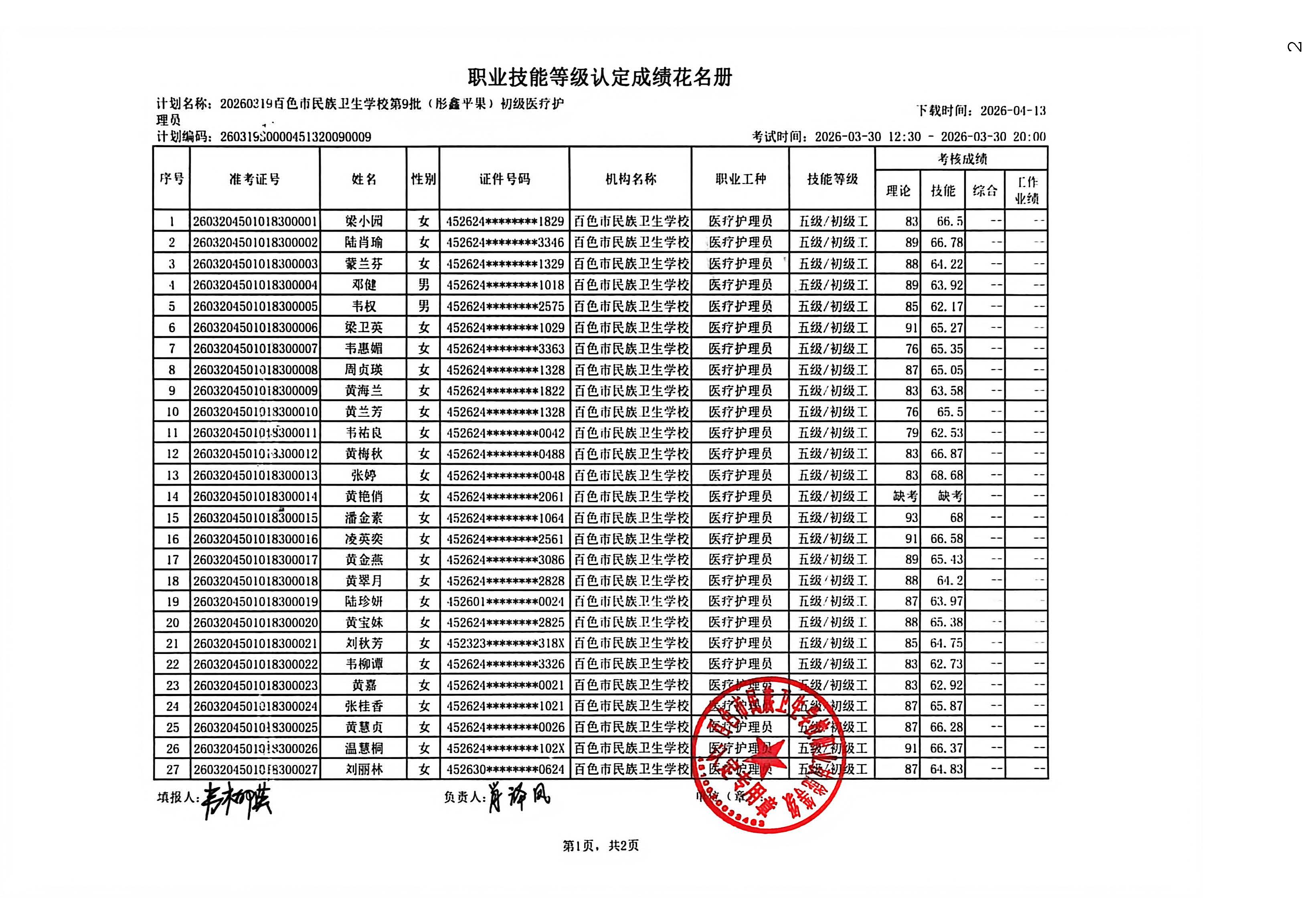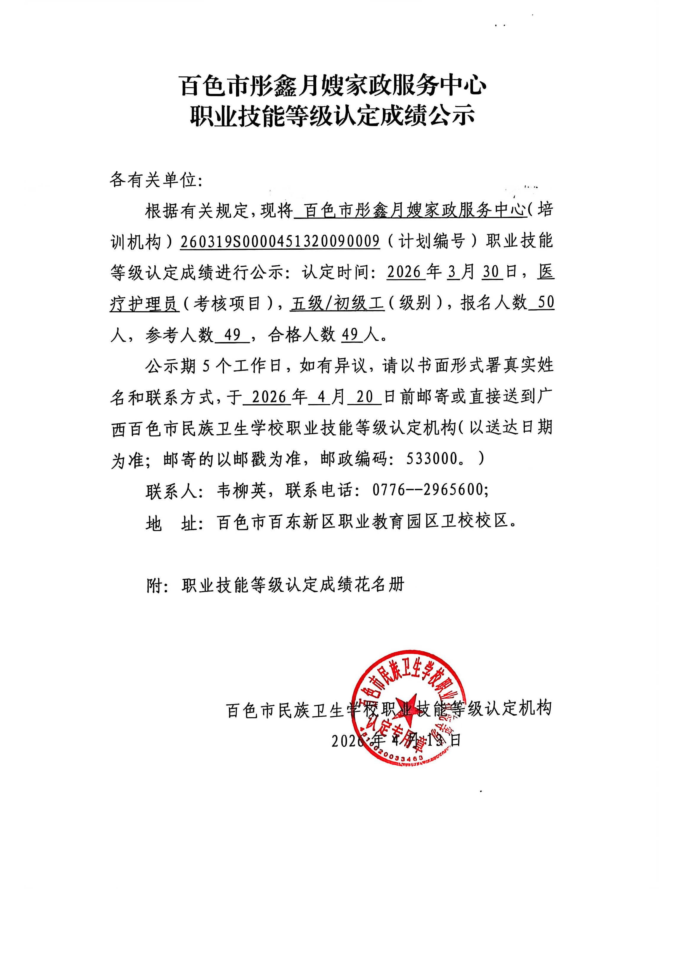百色市彤鑫月嫂家政服务中心职业技能等级认定成绩公示(2026.3.30)